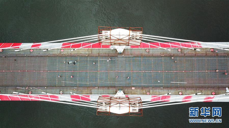 工人在大橋上進(jìn)行橋面鋪裝施工作業(yè)(8月19日攝)。新華社記者王建威攝