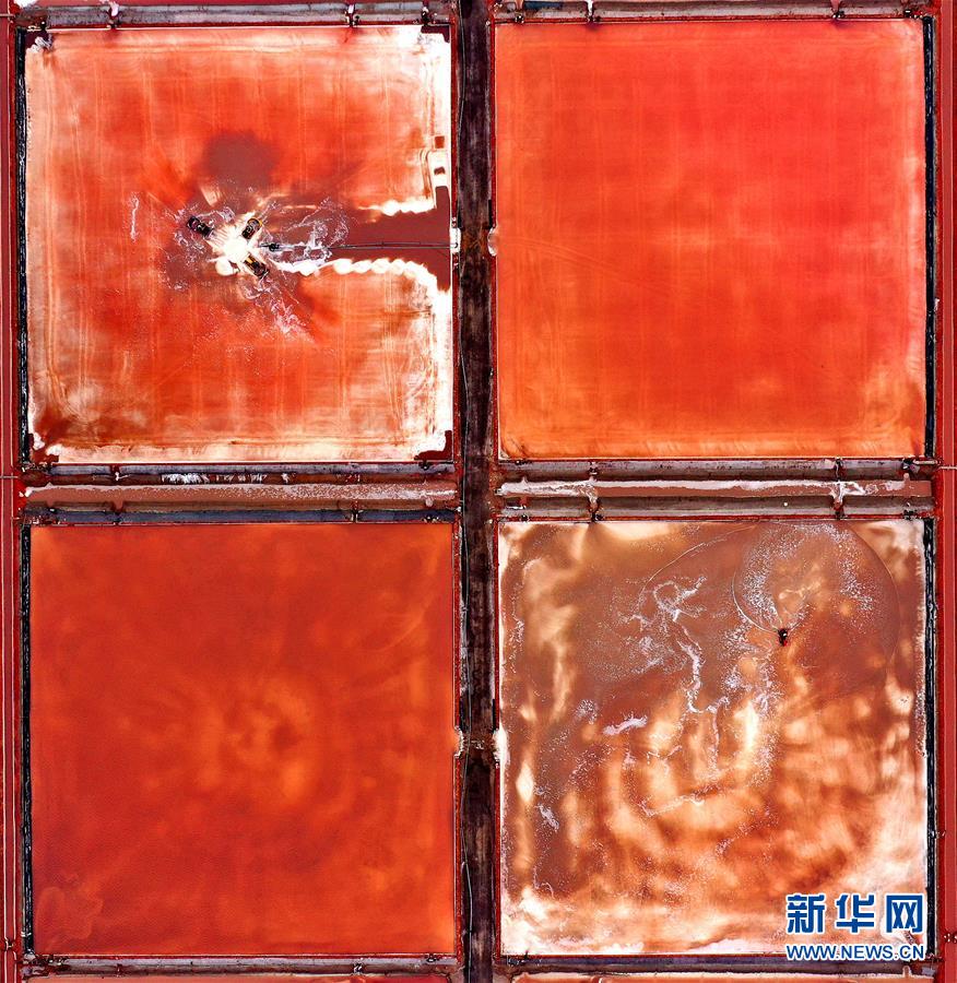 日前,山東省無棣縣境內(nèi)的魯北鹽場進入海鹽收獲季節(jié),星羅棋布的鹽池將大地裝扮得繽紛如畫。無棣縣位于山東省北部渤海之濱,全縣擁有鹽田365萬公畝,是我國重要的海鹽生產(chǎn)基地。據(jù)無棣縣工信局統(tǒng)計,今年1-9月份,當(dāng)?shù)卦}產(chǎn)量111.7萬噸。