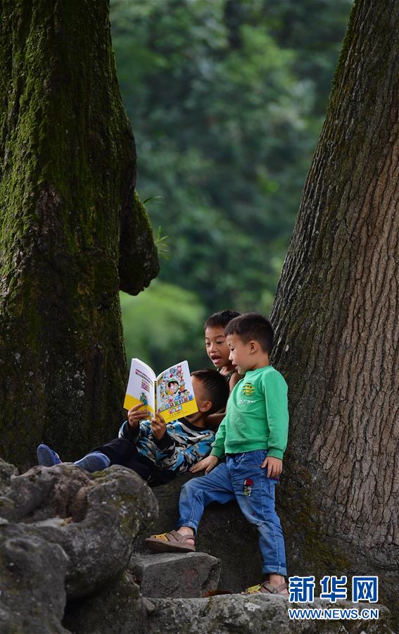 黔桂烏英苗寨的孩子們?cè)陂喿x剛剛獲贈(zèng)的圖書(10月11日攝)。