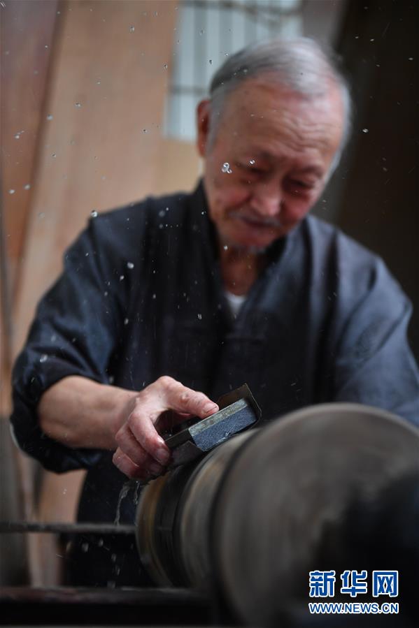 10月12日,丁國(guó)坤在家中對(duì)一件未成形的脫胎漆器進(jìn)行“水磨”工序。新華社記者胡晨歡攝
