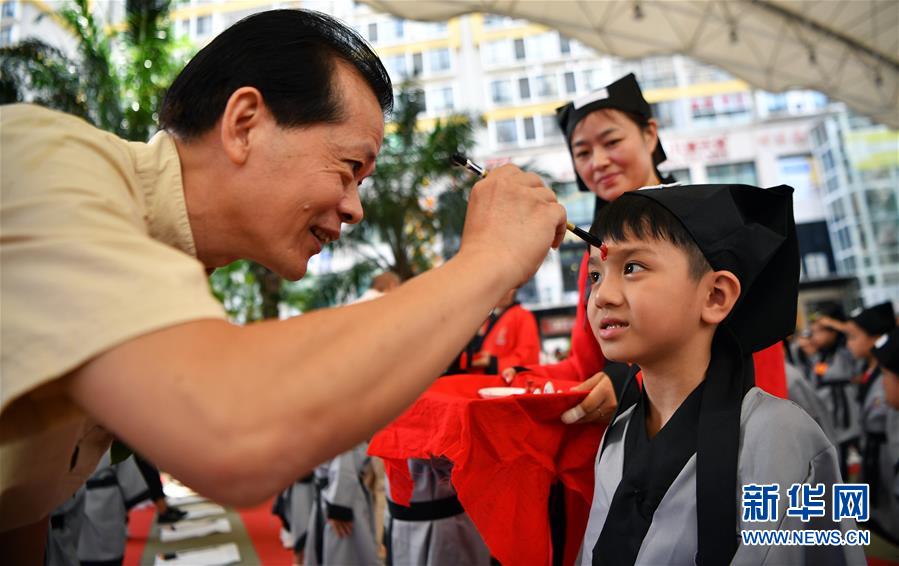 10月13日,參加儀式的嘉賓為小朋友“點朱砂”。當(dāng)日,??诤嬌賰核囆g(shù)中心為500名小朋友舉行“開筆禮”,通過“點朱砂,啟智慧”“習(xí)書法,描人字”等儀式讓孩子們體驗中國傳統(tǒng)文化。新華社記者郭程攝