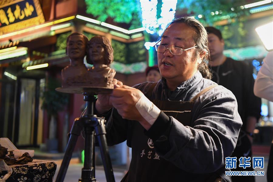 10月12日,長(zhǎng)沙火宮殿內(nèi)一名泥塑手藝人在為顧客捏塑像。新華社記者薛宇舸攝