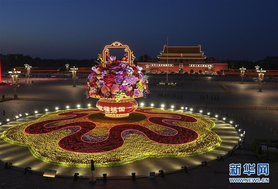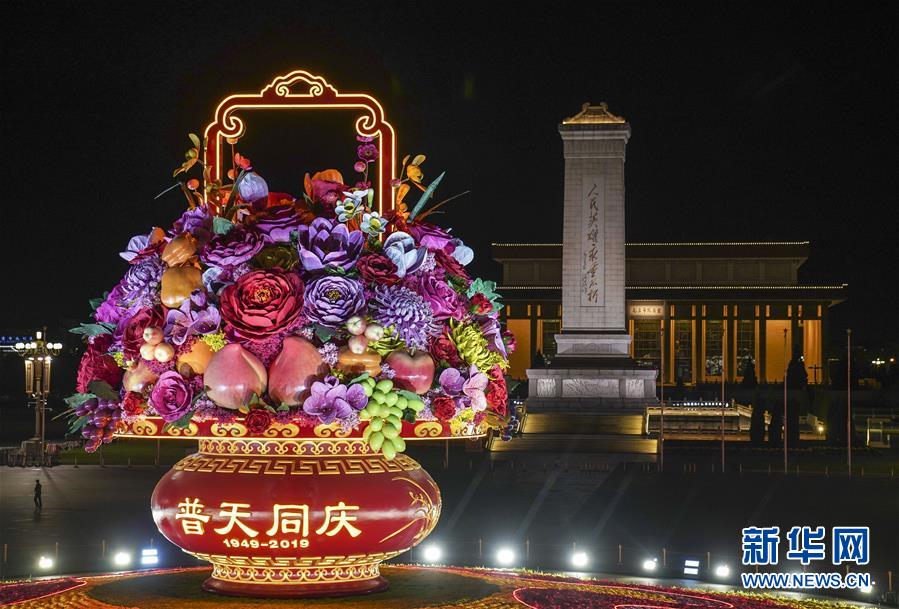 這是10月14日拍攝的天安門廣場(chǎng)中心花壇。 10月14日,以“花果籃”為主造型的天安門廣場(chǎng)中心花壇吸引了眾多游客參觀拍照。“花果籃”的夜景更是流光溢彩,絢爛迷人。 新華社記者 殷剛 攝