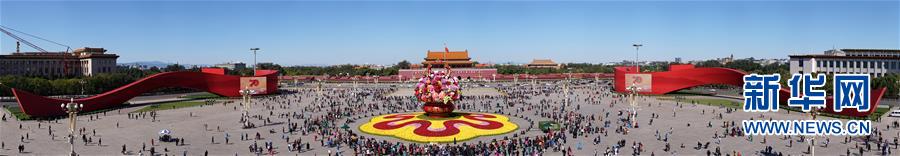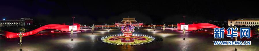這是10月14日拍攝的天安門廣場(chǎng)中心花壇(全景拼接圖片)。 10月14日,以“花果籃”為主造型的天安門廣場(chǎng)中心花壇吸引了眾多游客參觀拍照。“花果籃”的夜景更是流光溢彩,絢爛迷人。 新華社記者 殷剛 攝