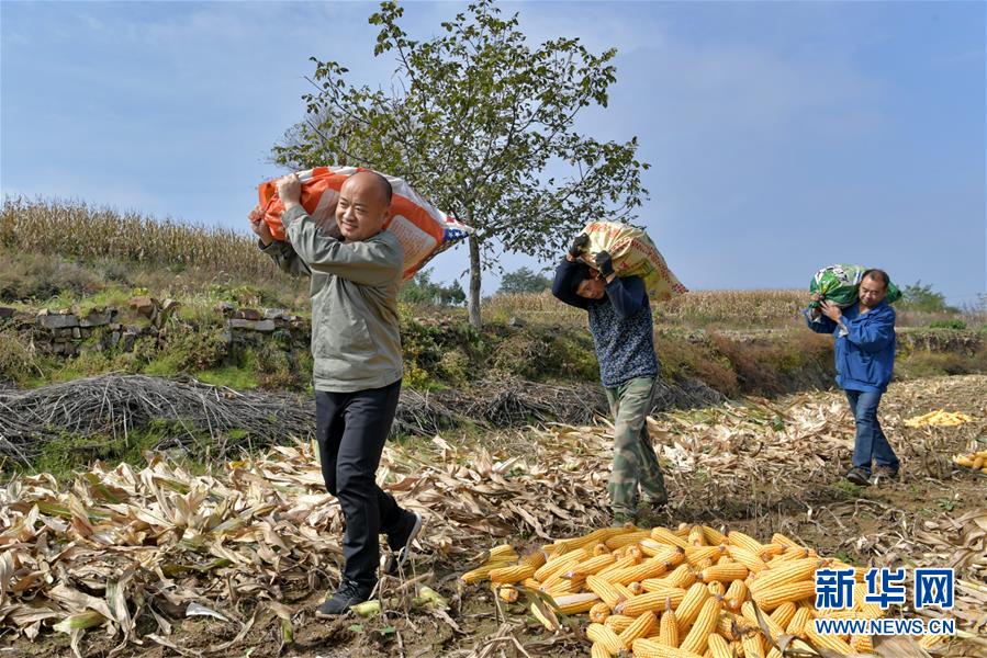 在奪火鄉(xiāng)高谷堆村,第一書記侯俊國(guó)(左)在幫助村民收玉米(10月13日攝)。 新華社記者 曹陽(yáng) 攝
