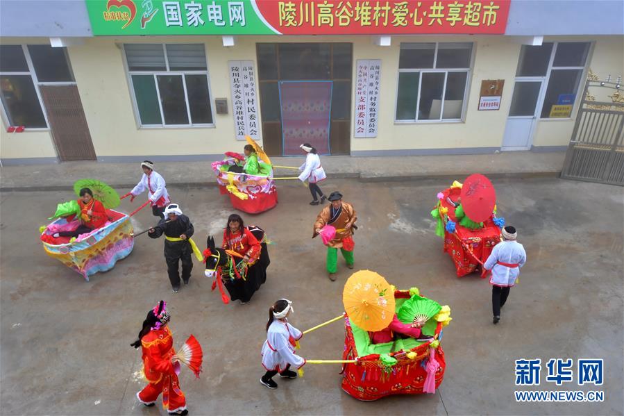 在奪火鄉(xiāng)高谷堆村,村民在排練傳統(tǒng)民俗節(jié)目“推小車”(10月14日攝)。 新華社記者 曹陽(yáng) 攝