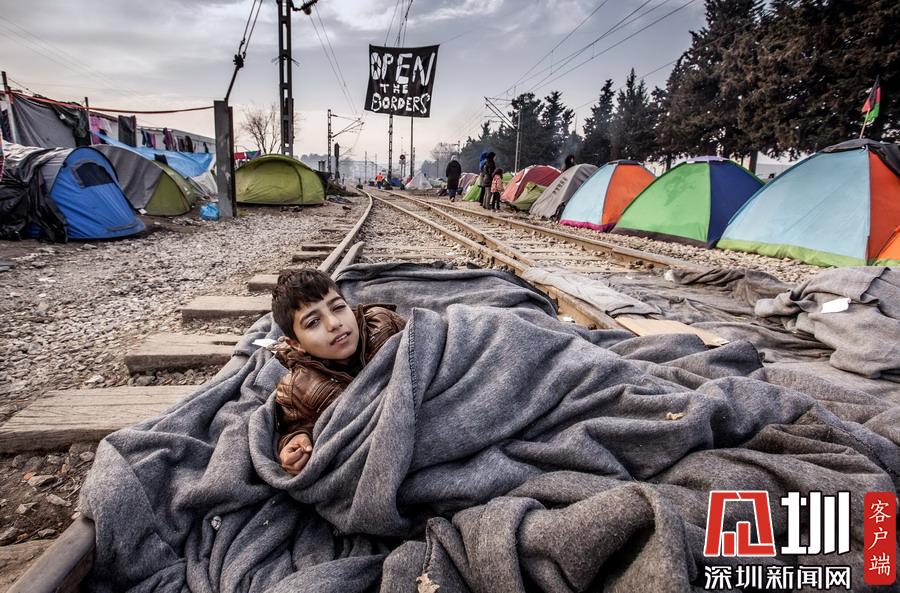 當(dāng)?shù)貢r(shí)間2016年3月22日,希臘伊多梅尼,來(lái)自敘利亞阿勒頗的難民男孩躺在鐵軌上睡覺(jué)。