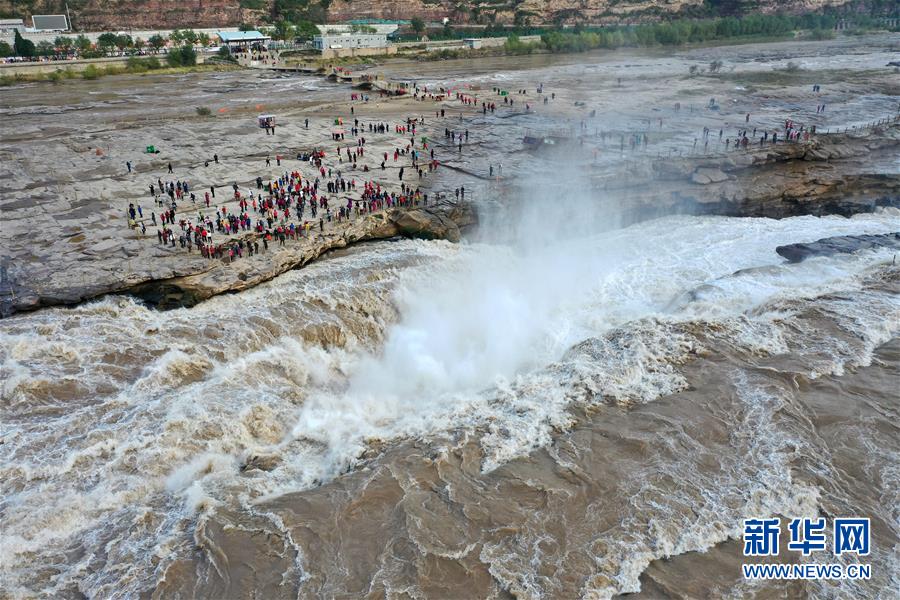 受近日降雨影響,位于山西吉縣的壺口瀑布水量增大,壯美的瀑布群景觀吸引眾多游客前來(lái)觀賞。新華社記者楊晨光攝