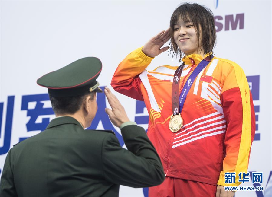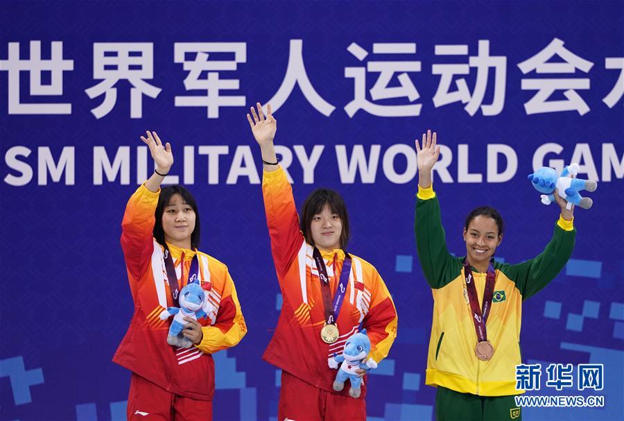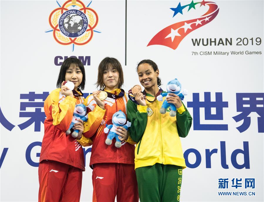10月20日,中國隊選手吳慧敏(右)、包雪怡在升旗儀式上。 當(dāng)日,在武漢舉行的第七屆世界軍人運動會水上救生項目女子50米假人救生決賽中,中國隊選手吳慧敏以33秒93的成績奪得冠軍,隊友包雪怡以35秒79的成績獲得亞軍。 新華社記者肖藝九攝