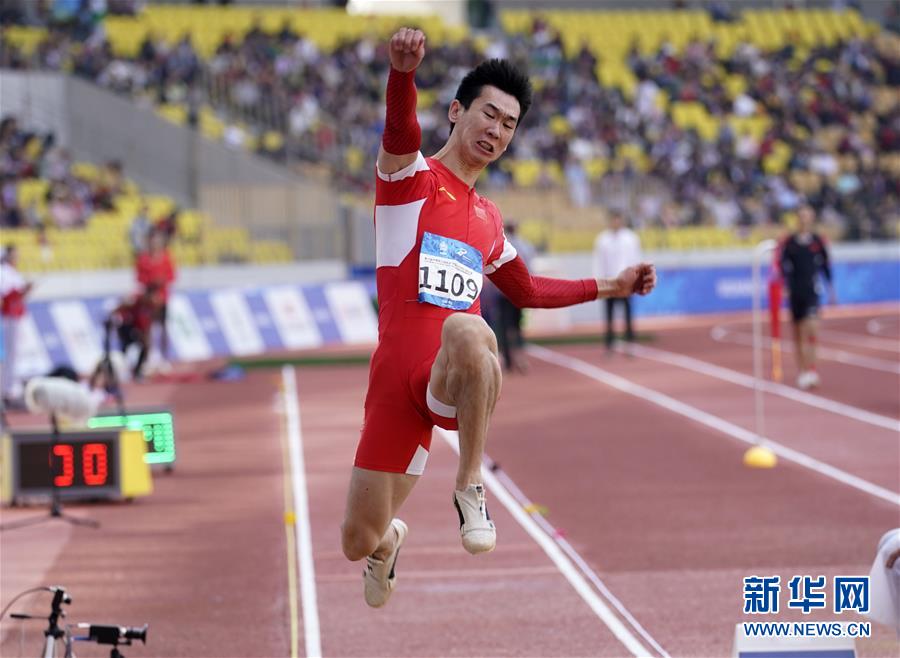 10月24日,中國選手王嘉男在比賽后慶祝。 當(dāng)日,在武漢舉行的第七屆世界軍人運(yùn)動會田徑項(xiàng)目男子跳遠(yuǎn)決賽中,中國選手王嘉男、黃常洲分別以8米15和8米12的成績獲得冠亞軍。 新華社記者金良快攝