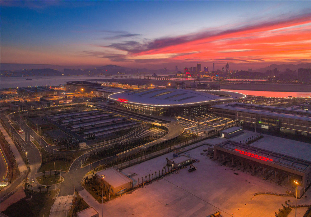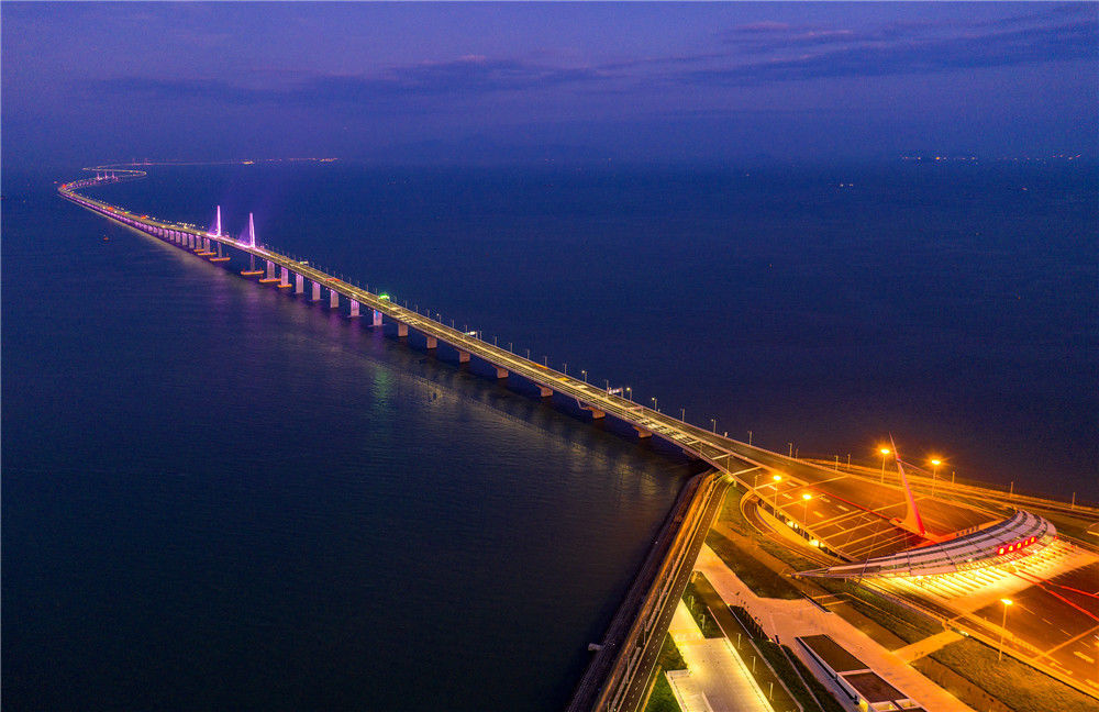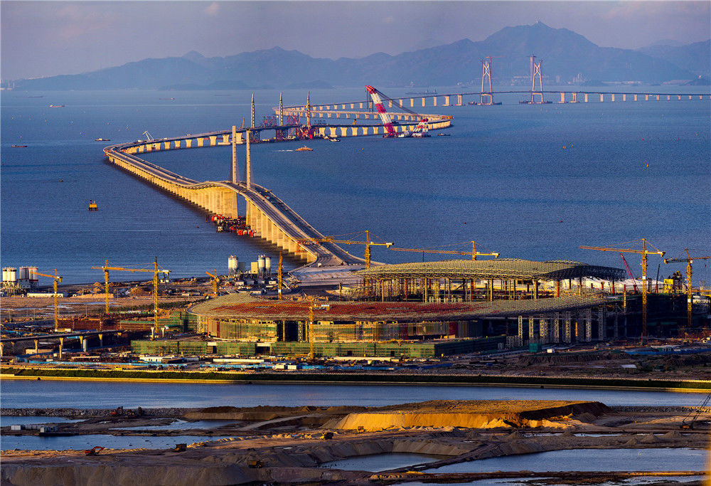 晨曦中的港珠澳大橋珠澳口岸人工島(10月24日無人機(jī)拍攝)。2018年10月23日,港珠澳大橋正式開通。在這座圓夢橋、同心橋、自信橋、復(fù)興橋開通一周年之際,記者親自體驗(yàn)“一橋連三地、一日游三城”的悠閑與便利,于不同的旖旎風(fēng)光中自在游覽,在不同的城市風(fēng)貌間自如切換。新華社記者張金加攝