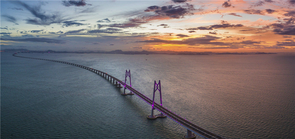 2018年7月18日,廣東珠海,滿天紅霞,亮燈后的港珠澳大橋跨立在伶仃洋上,進(jìn)入通車前的最后準(zhǔn)備。張由瓊/視覺中國