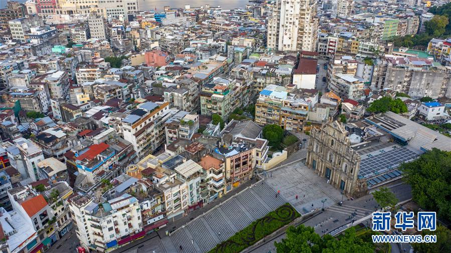 10月24日早晨無人機(jī)拍攝的澳門著名歷史遺跡——大三巴牌坊及周邊區(qū)域。2018年10月23日,港珠澳大橋正式開通。新華社記者張金加攝