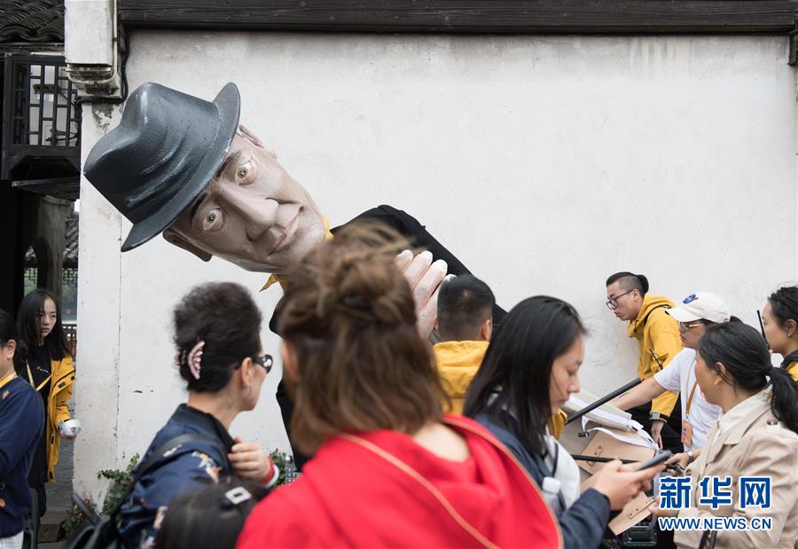 10月26日,游客經(jīng)過(guò)一個(gè)正在豎起的戲劇人偶。 新華社記者翁忻旸攝