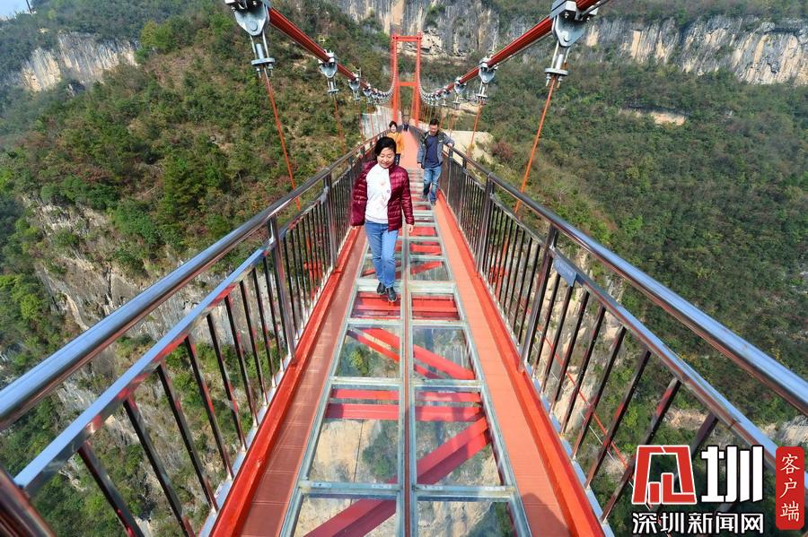 2017年11月5日,游客走在湖北省保康縣歇馬鎮(zhèn)九路寨景區(qū)戰(zhàn)口河人行懸索橋上觀光。