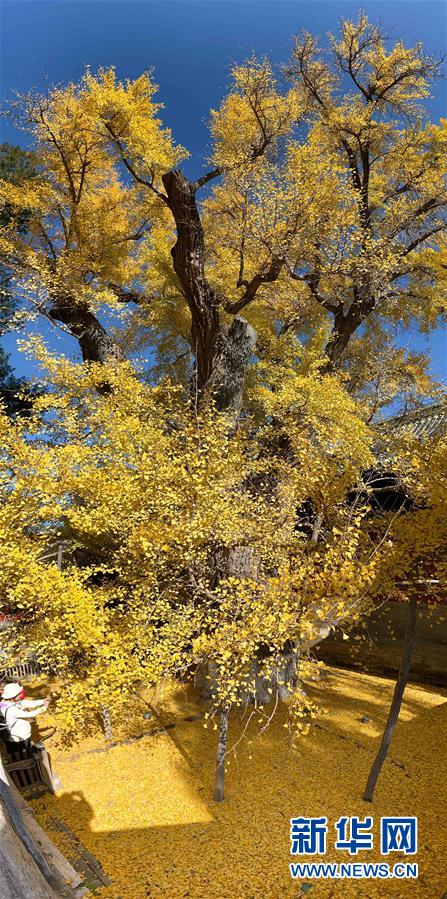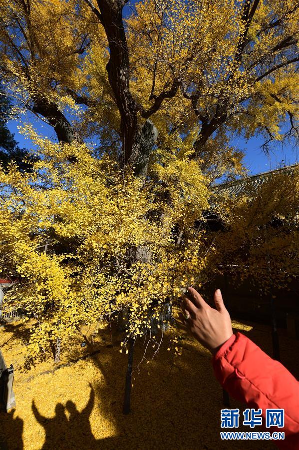 11月11日,人們在大覺寺內(nèi)的古銀杏樹旁留影。新華社記者尹棟遜攝