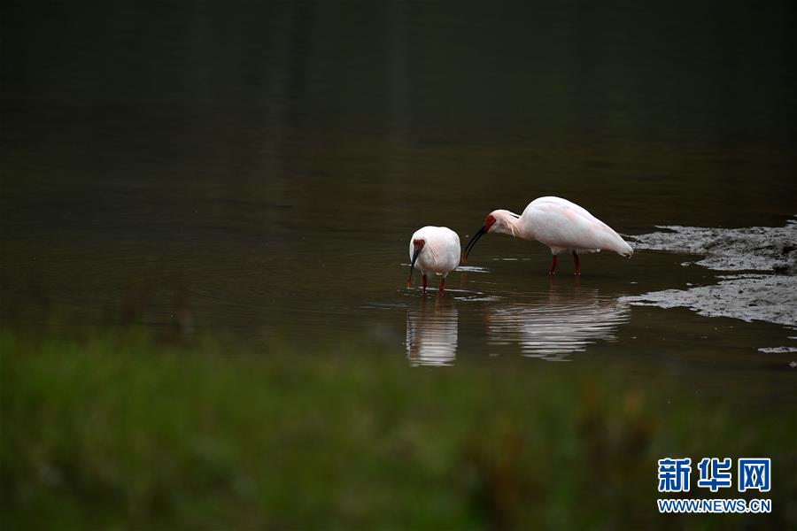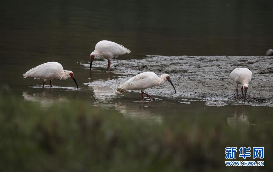 11月19日,朱鹮在陜西省漢中市西鄉(xiāng)縣峽口鎮(zhèn)井壩村牧馬河里覓食。  新華社記者陶明攝