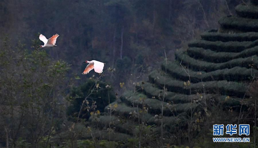 11月19日,朱鹮飛翔在陜西省漢中市西鄉(xiāng)縣峽口鎮(zhèn)牧馬河畔。  新華社記者陶明攝