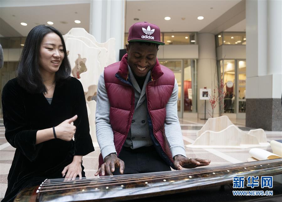 11月22日,在美國華盛頓,一名參加“北京日”文化廟會活動的男子學習彈奏古琴。作為中國北京和美國首都華盛頓締結友好城市35周年慶?;顒拥囊徊糠?,“北京日”文化廟會22日在華盛頓羅納德·里根大廈和國際貿易中心舉行。新華社記者劉杰攝