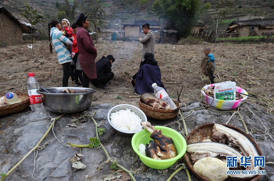 11月24日,在昭覺縣支爾莫鄉(xiāng)阿土列爾村,當(dāng)?shù)鼐用駵?zhǔn)備熟食、酒等食物祭祖,并相互贈(zèng)送。11月20日至26日是四川省涼山彝族自治州大小涼山彝族群眾傳統(tǒng)節(jié)日——彝族年,懸崖上的阿土列爾村的彝族群眾殺年豬、祭祀和走親拜年,慶祝一年一度的彝族年。阿土列爾村是“懸崖村”,位于四川省涼山彝族自治州昭覺縣支爾莫鄉(xiāng),坐落在海拔1400-1600米山坳中,這里居住著60多戶彝族群眾,村民走出大山,需要攀爬懸崖。新華社記者江宏景攝