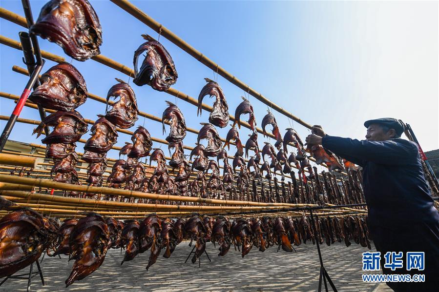 12月3日,安昌古鎮(zhèn)一家名為阿紅香腸的傳統(tǒng)臘味作坊里的工作人員在晾曬各種手工制作的紹興臘味。新華社記者徐昱攝