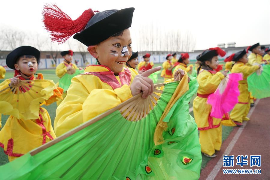 12月19日,河北省灤州市小閆營(yíng)小學(xué)學(xué)生在排練地秧歌。新華社記者 牟宇 攝