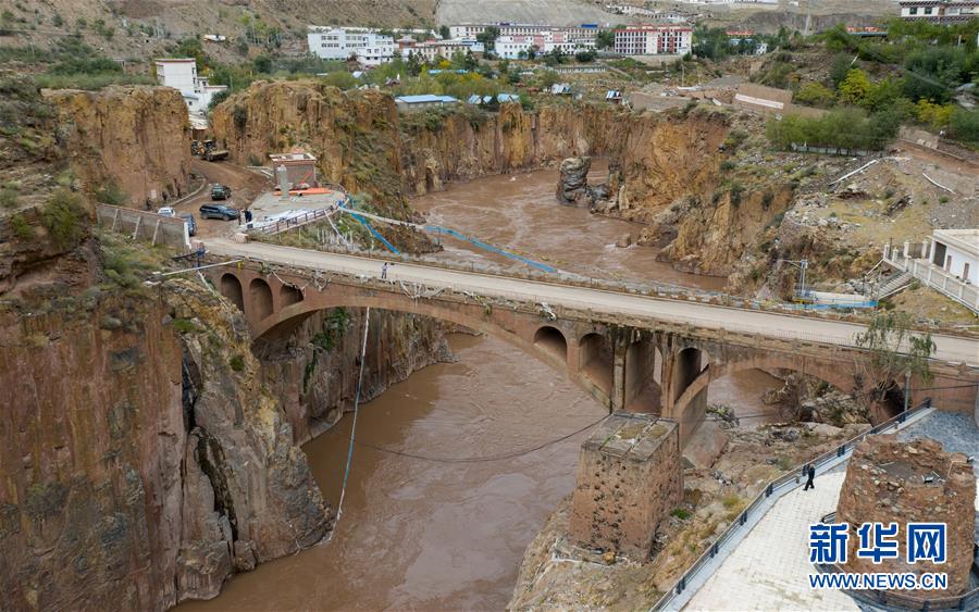 在西藏八宿的怒江大橋旁矗立著一座橋墩(10月23日攝)。據(jù)十八軍后人介紹,工兵5團(tuán)一位戰(zhàn)士修橋時(shí)過(guò)于疲憊,不慎掉入了正在澆注的橋墩中,成了永遠(yuǎn)的紀(jì)念碑。新華社記者江宏景攝