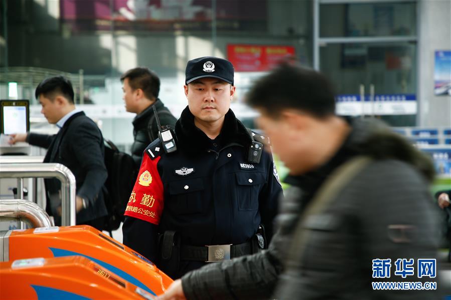 金寨火車站派出所民警張嗣一(右二)在檢票口執(zhí)勤(12月19日攝)。新華社記者陳立群攝