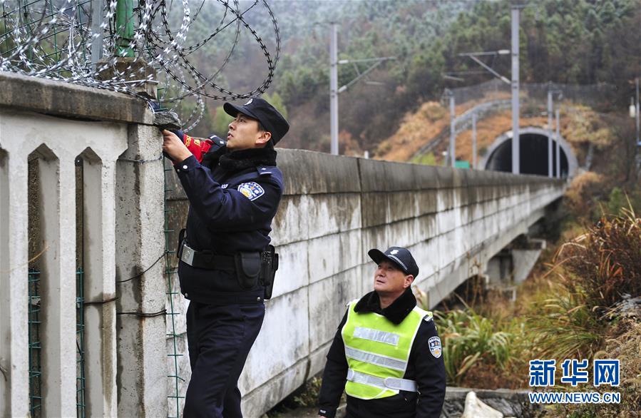 12月18日,常曉龍(左)在排查鐵路沿線護欄的安全隱患。新華社記者鄧堅攝