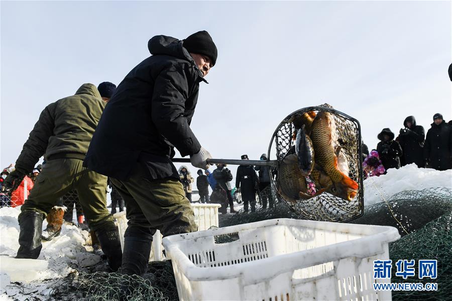 12月18日,一名工作人員將捕撈上來(lái)的魚(yú)放入筐中。新華社記者劉磊攝