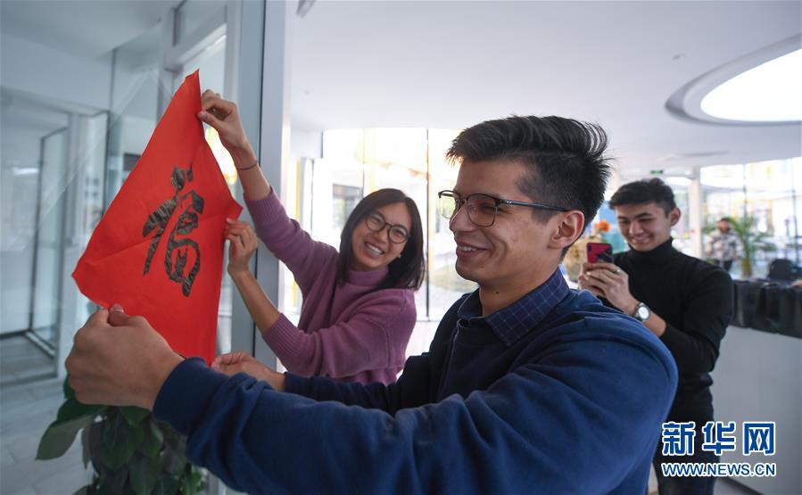 12月27日,來自俄羅斯的留學(xué)生阿布(中)在瓜山新苑社區(qū)活動(dòng)中心與中國青年一起貼福字。新華社記者 徐昱 攝