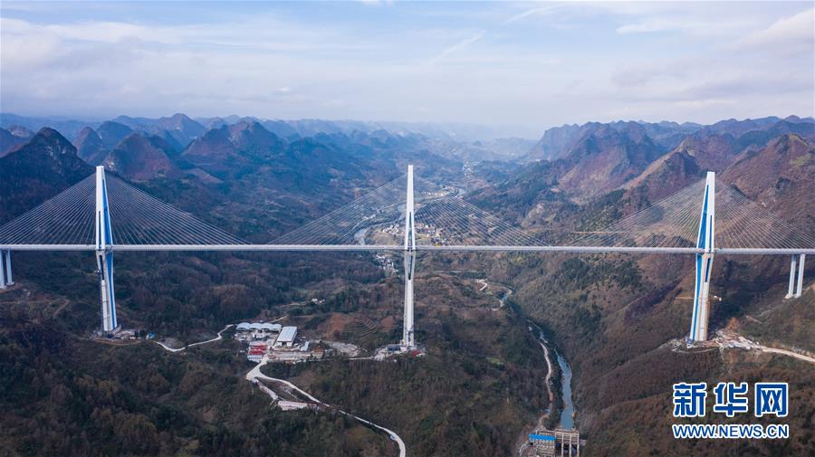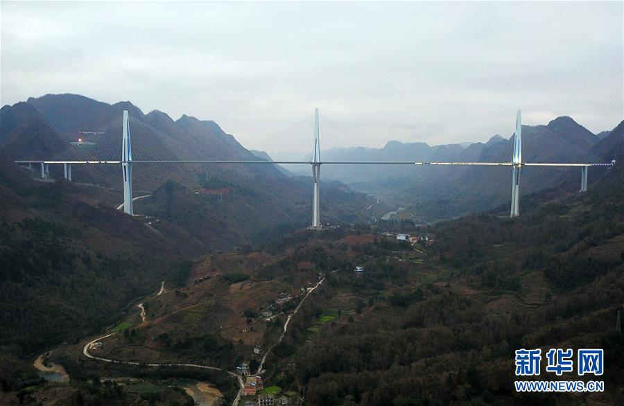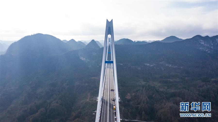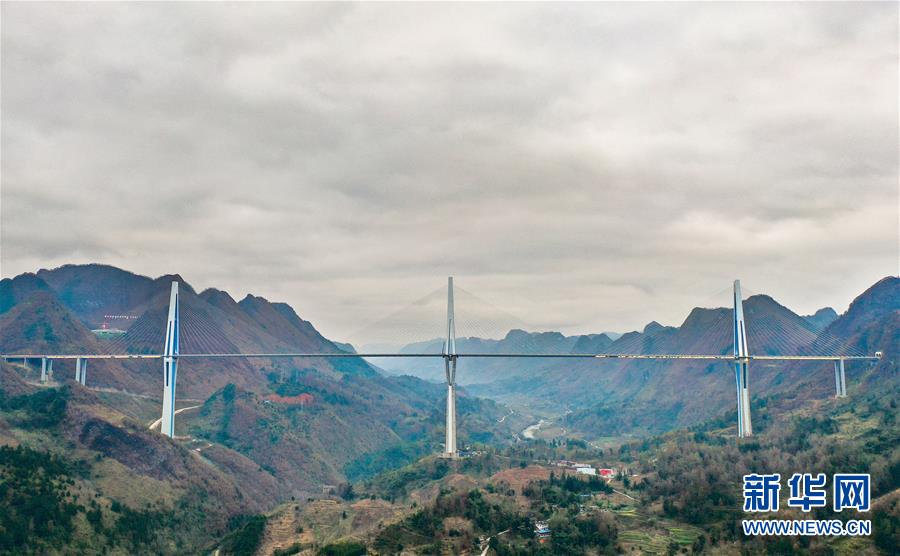 2019年1月7日無人機(jī)航拍的平塘特大橋橋塔全景,中為高332米的世界第一高混凝土橋塔。新華社記者歐東衢攝