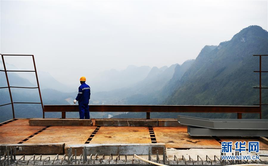 2019年1月7日,建設(shè)者在世界第一高混凝土橋塔上建設(shè)平塘特大橋。新華社記者歐東衢攝