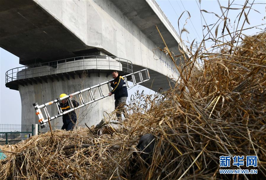1月3日,中國鐵路濟(jì)南局臨沂工務(wù)段工程技術(shù)員在沂河特大橋橋墩上檢查。新華社記者 朱崢攝