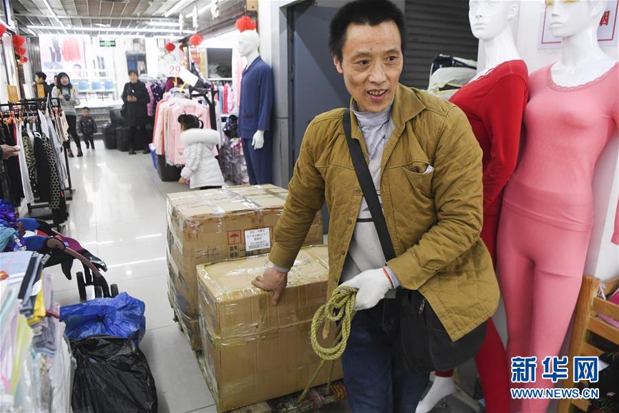 冉光輝在重慶朝天門大正商場(chǎng)內(nèi)搬運(yùn)貨物(1月5日攝)。新華社記者王全超攝