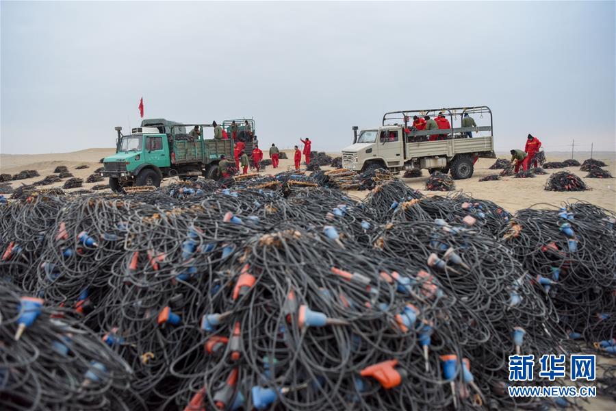 1月14日,放線工在出工前將一捆捆檢波器裝車。地球物理勘探是油氣開發(fā)的第一步,相當于給地球做CT。物探工人按照嚴格的測線部署,在相應位置鉆井,然后實施地震,采集地震波數(shù)據(jù)。科研人員通過數(shù)據(jù)組成的“CT片”,就能夠清晰地“看”到地下的地質(zhì)結(jié)構(gòu),判斷哪里埋藏有石油或者天然氣。2019年10月,東方地球物理勘探有限責任公司塔里木物探處2113隊進入新疆塔克拉瑪干沙漠腹地,開始中古14-21、塔中2兩個區(qū)塊的三維地震勘探。近2000名物探工人將在1000平方公里的范圍內(nèi)一直工作到2020年4月,這也意味著他們將在塔克拉瑪干沙漠腹地連續(xù)度過第14個除夕夜。蘊藏著豐富石油天然氣資源的新疆塔克拉瑪干沙漠有“死亡之海”之稱,氣候干燥,年降水量在50毫米以下,冬季地表最低溫度超過零下30攝氏度,是世界油氣勘探難度最大的地區(qū)之一。為避開風季,物探工人每年9、10月份進入沙漠,一直工作到來年4月,夜以繼日與黃沙、嚴寒為伴,用辛勤的汗水,為祖國找油找氣。新華社記者丁磊攝
