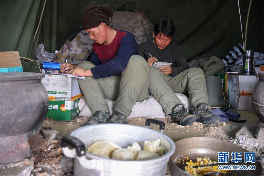 1月14日,查線工在吃飯間隙收聽電臺里報出的不正常道樁號,并記錄在本子上。地球物理勘探是油氣開發(fā)的第一步,相當于給地球做CT。物探工人按照嚴格的測線部署,在相應位置鉆井,然后實施地震,采集地震波數(shù)據(jù)??蒲腥藛T通過數(shù)據(jù)組成的“CT片”,就能夠清晰地“看”到地下的地質(zhì)結(jié)構(gòu),判斷哪里埋藏有石油或者天然氣。2019年10月,東方地球物理勘探有限責任公司塔里木物探處2113隊進入新疆塔克拉瑪干沙漠腹地,開始中古14-21、塔中2兩個區(qū)塊的三維地震勘探。近2000名物探工人將在1000平方公里的范圍內(nèi)一直工作到2020年4月,這也意味著他們將在塔克拉瑪干沙漠腹地連續(xù)度過第14個除夕夜。蘊藏著豐富石油天然氣資源的新疆塔克拉瑪干沙漠有“死亡之?!敝Q,氣候干燥,年降水量在50毫米以下,冬季地表最低溫度超過零下30攝氏度,是世界油氣勘探難度最大的地區(qū)之一。為避開風季,物探工人每年9、10月份進入沙漠,一直工作到來年4月,夜以繼日與黃沙、嚴寒為伴,用辛勤的汗水,為祖國找油找氣。新華社記者丁磊攝