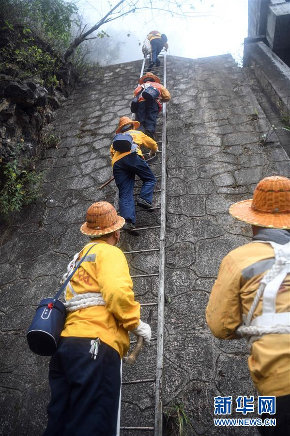 1月14日,百色工務(wù)段白水河橋隧工區(qū)班組成員攀梯上山開(kāi)展巡查工作。在中國(guó)鐵路南寧局集團(tuán)公司百色工務(wù)段白水河橋隧工區(qū),有一個(gè)由14名工人組成的班組。他們常年像“爬山虎”一樣行走攀爬在地形險(xiǎn)峻、云霧繚繞的高山上,負(fù)責(zé)南昆鐵路轄區(qū)路段的搜山掃石工作,清除一切可能危害鐵路行車安全的因素,保障旅客出行安全。新華社記者張愛(ài)林?jǐn)z