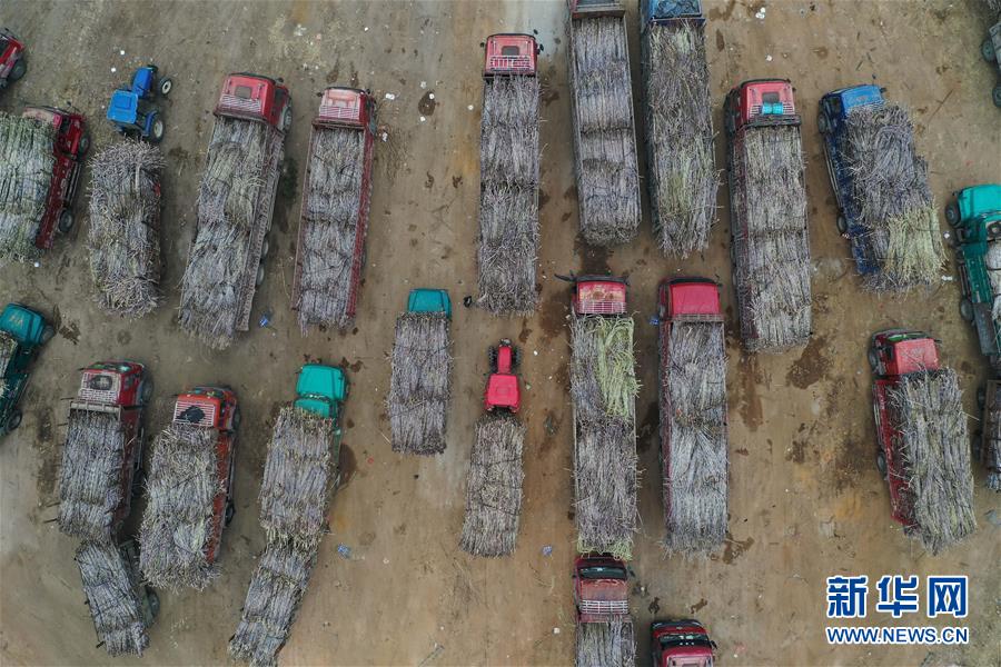 1月13日,運蔗車輛排隊進入鹿寨縣一家制糖企業(yè)(無人機照片)。新華社記者黃孝邦攝