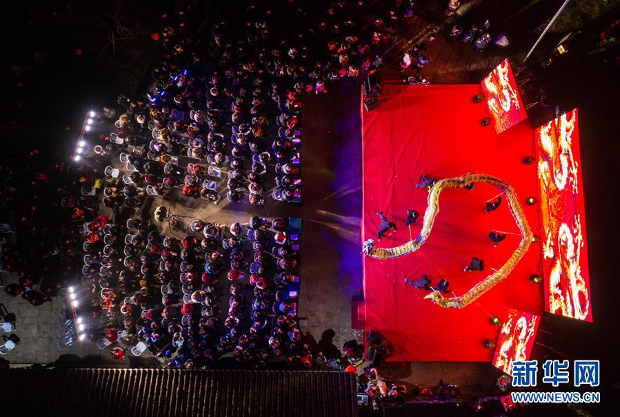1月14日,杭州市余杭區(qū)中泰街道中橋村的文化公園內(nèi)在進行“我們的村晚”舞龍表演,吸引了大批當(dāng)?shù)匕傩沼^看(無人機照片)。臨近春節(jié),浙江省杭州市余杭區(qū)中泰街道各村社的文化禮堂紛紛上演“我們的村晚”。老百姓自編、自導(dǎo)、自演為主的“土味”聯(lián)歡會因接地氣、親情濃而深受當(dāng)?shù)匕傩盏南矏郏蔀楫?dāng)?shù)剜l(xiāng)村百姓的新年迎春“文化大餐”。近年來,中泰街道以文化振興助推鄉(xiāng)村振興。目前,中泰街道下屬各村陸續(xù)建成文化禮堂7個、社區(qū)文化家園2個,努力培育和挖掘出一批鄉(xiāng)土文化人才及原創(chuàng)作品,2019年全年開展各類鄉(xiāng)村社區(qū)惠民文體活動累計180余場次。新華社記者徐昱攝