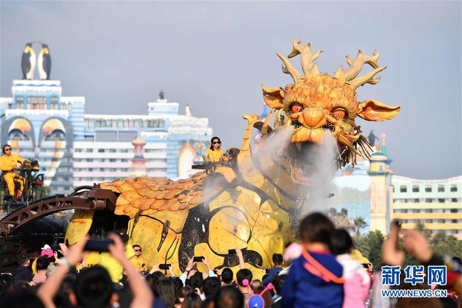 1月18日,大型機(jī)械裝置藝術(shù)品“龍馬精神”在珠海長(zhǎng)隆海洋王國(guó)巡游展示。