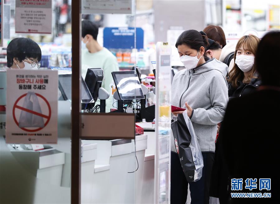 2月24日,在韓國首爾,當?shù)鼐用裨邶埳絽^(qū)一家日用品商店排隊結(jié)賬。  新華社記者 王婧嬙 攝