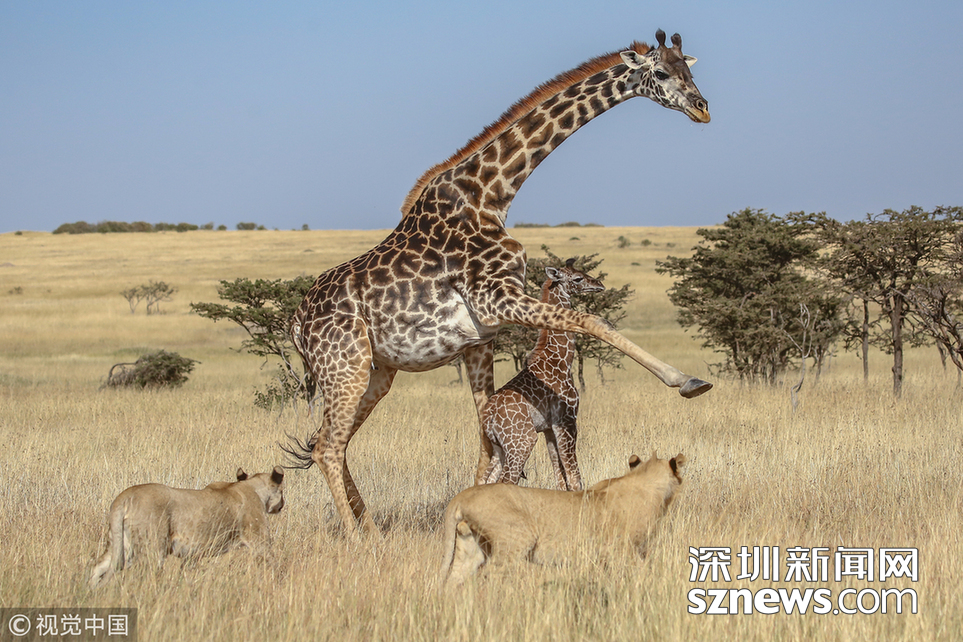 當(dāng)?shù)貢r(shí)間2018年8月15日,肯尼亞馬賽馬拉,當(dāng)?shù)貙?dǎo)游詹姆斯·納帕索(James Nampaso)拍攝到一群獅子圍攻母長頸鹿和她的幼崽。盡管長頸鹿勇敢地抵抗獅群的進(jìn)攻,但當(dāng)一頭母獅跳上它的脊背時(shí),它被分散了注意力,使得獅群最終捕獲了它的孩子。