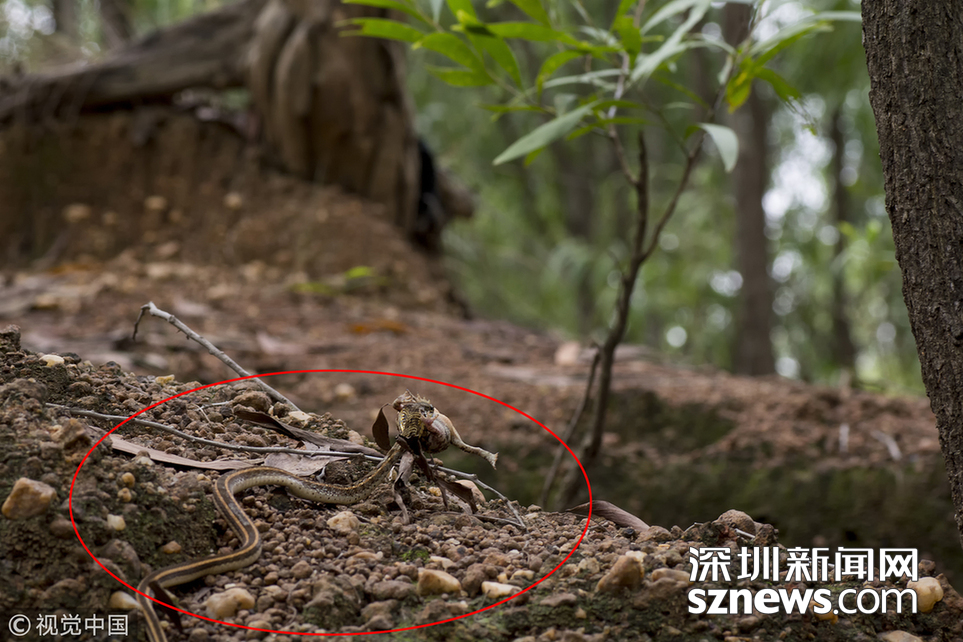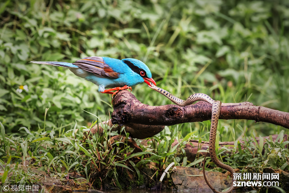 2018年7月18日,廣東東莞,藍(lán)綠鵲與蛇的地盤爭斗。