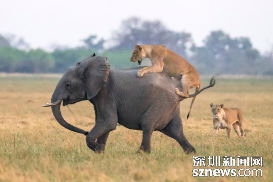 英國攝影師詹姆斯(James Gifford)在博茨瓦納喬貝國家公園拍到一群獅子獵食大象的精彩畫面。在詹姆斯的鏡頭下,一頭母獅跳到了一頭小象的背上想要將其拿下,但僅憑一己之力又不能做到。但當母獅的后援抵達時,象群也趕到了現(xiàn)場。最終,小象回到了象群中獲得庇護,而獅群也不得不悻悻離去。