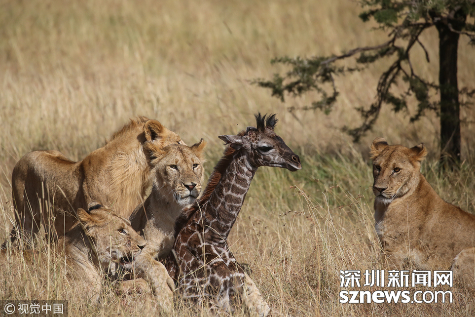 當(dāng)?shù)貢r間2018年8月15日,肯尼亞馬賽馬拉,當(dāng)?shù)貙?dǎo)游詹姆斯·納帕索(James Nampaso)拍攝到一群獅子圍攻母長頸鹿和她的幼崽。盡管長頸鹿勇敢地抵抗獅群的進攻,但當(dāng)一頭母獅跳上它的脊背時,它被分散了注意力,使得獅群最終捕獲了它的孩子。