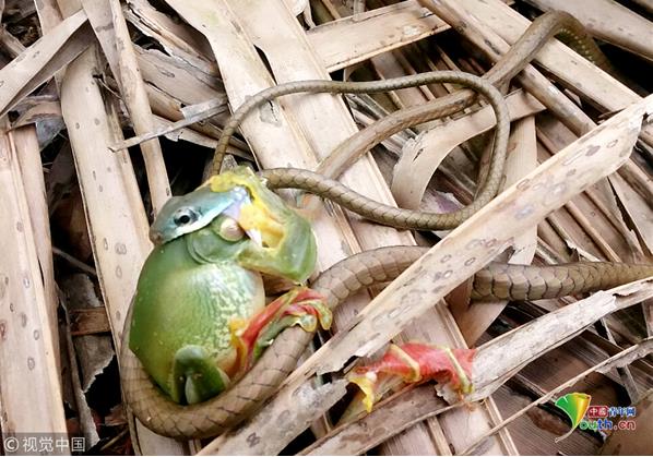 2018年7月18日,廣東東莞,藍綠鵲與蛇的地盤爭斗。