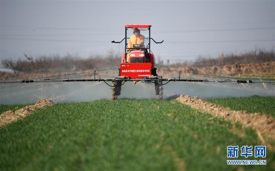 3月4日,建建農(nóng)機(jī)合作社社員在蒲城縣椿林鎮(zhèn)平峨村駕駛自走式高桿噴霧機(jī)為小麥噴灑除草殺菌劑。近日,為確保疫情期間不誤農(nóng)時,陜西省蒲城縣植保植檢站組織縣內(nèi)7家農(nóng)作物病蟲害專業(yè)化防治單位,在小麥返青起身期,對麥田進(jìn)行除草及病蟲害的防控工作。新華社記者李一博攝