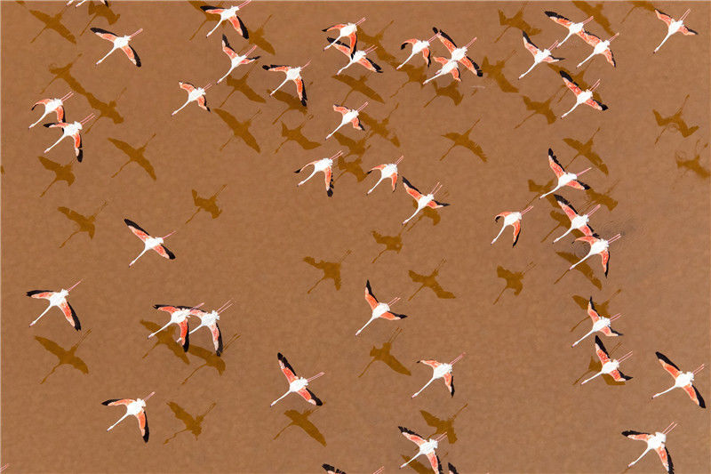 2018年1月9日訊(具體拍攝時間不詳), 西班牙卡迪茲海灣,數(shù)百只粉紅色的火烈鳥飛過五顏六色的鹽沼,在水面上形成令人驚嘆的倒影。太陽落山時分,攝影師Oscar Diez在300米高空的飛機(jī)上拍下這些令人震撼的照片。Oscar Diez/Solent News/視覺中國