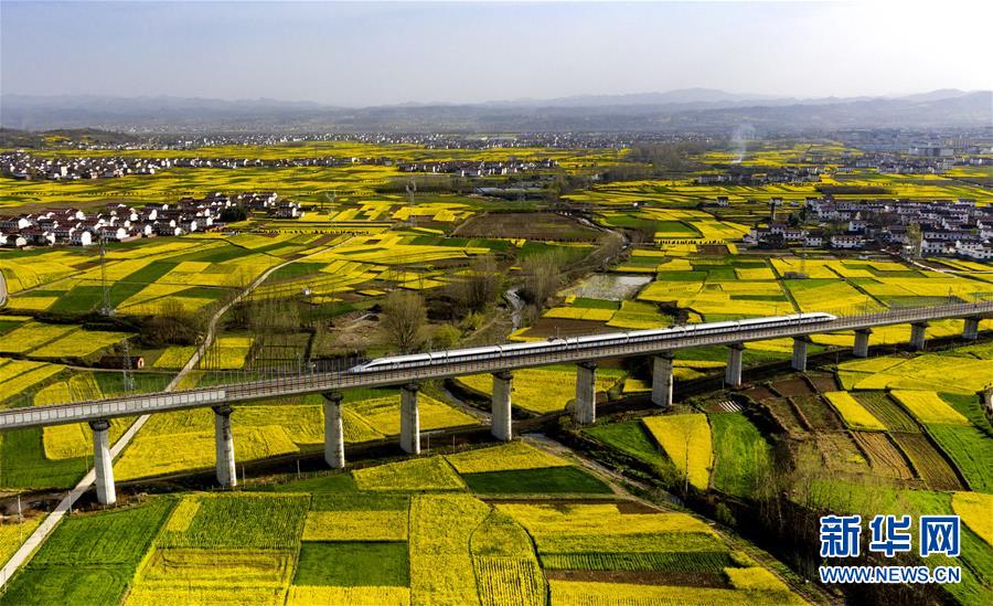 3月14日,一列動車從洋縣油菜花海中駛過(無人機照片)。近日,秦嶺南麓的陜西省漢中市洋縣14萬畝油菜花競相開放,美景如畫。新華社記者陶明攝
